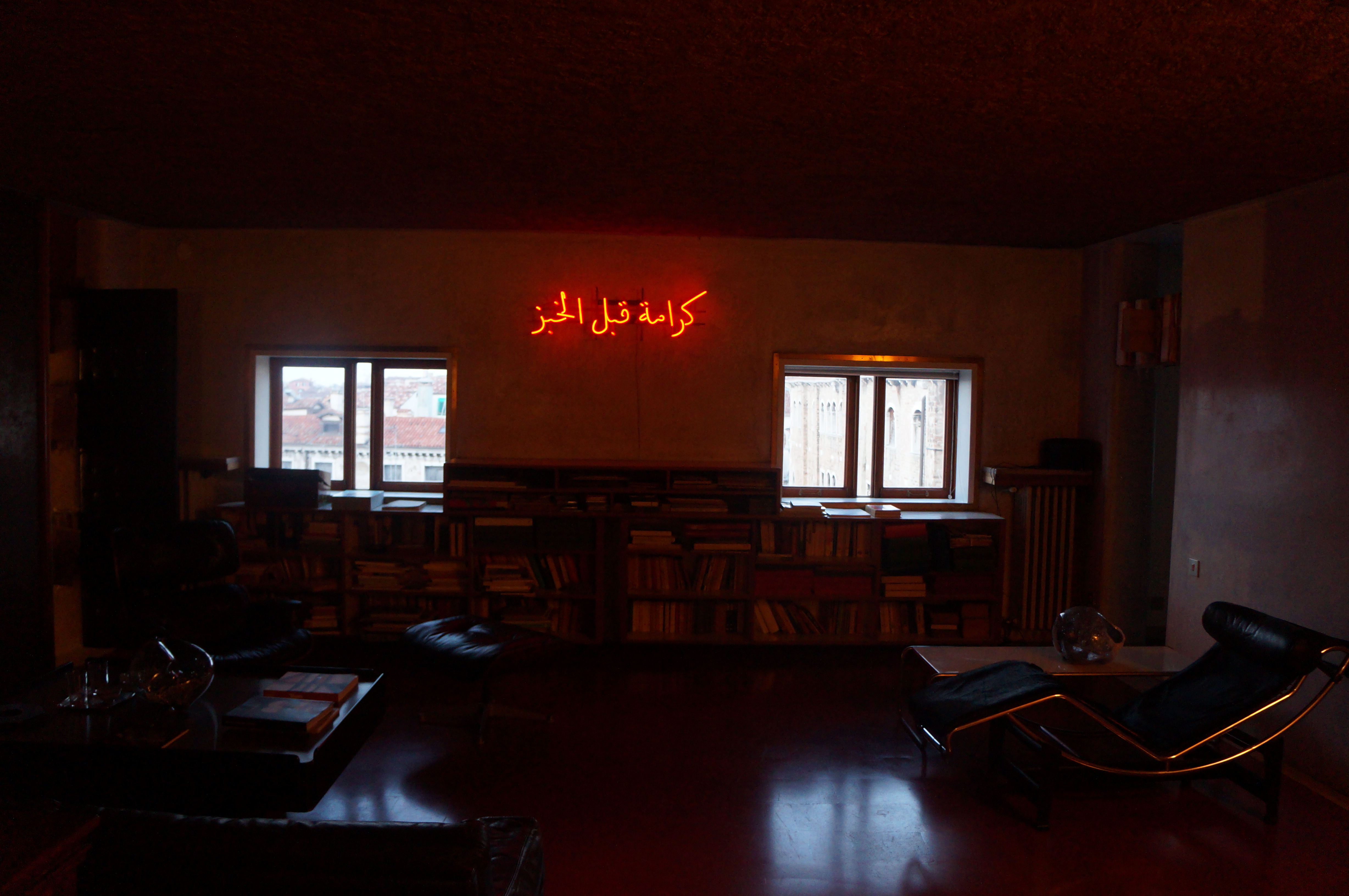 Bisogna andare in Calle degli Avvocati 3907, citofono Scatturin: si tratta dell’appartamento studio di Luigi Scatturin, avvocato che morì nel 2009 lasciando la sua abitazione all’arte. Tutti gli arredi sono nientemeno che di Carlo Scarpa, che alla metà degli anni Cinquanta fu invitato da Scatturin a progettare gli interni del suo studio-abitazione. Scarpa si occupò integralmente i 250 metri quadrati della casa all’ultimo piano di un edificio del XVII secolo, dagli interventi architettonici ai complementi d’arredo. Lo scambio intellettuale ed il rapporto dialettico tra l’avvocato e l’artista-architetto sono alla base del progetto espositivo Signori prego si accomodino, che appunto nell’appartamento trova sede ed è visitabile. “In questi giorni abitiamo qui – dice Jeraldine Blais Zodo, che con Pier Paolo Pancotto cura la mostra direttamente nella casa-studio dell’avvocato -… abitiamo noi due e gli artisti che abbiamo invitato”.