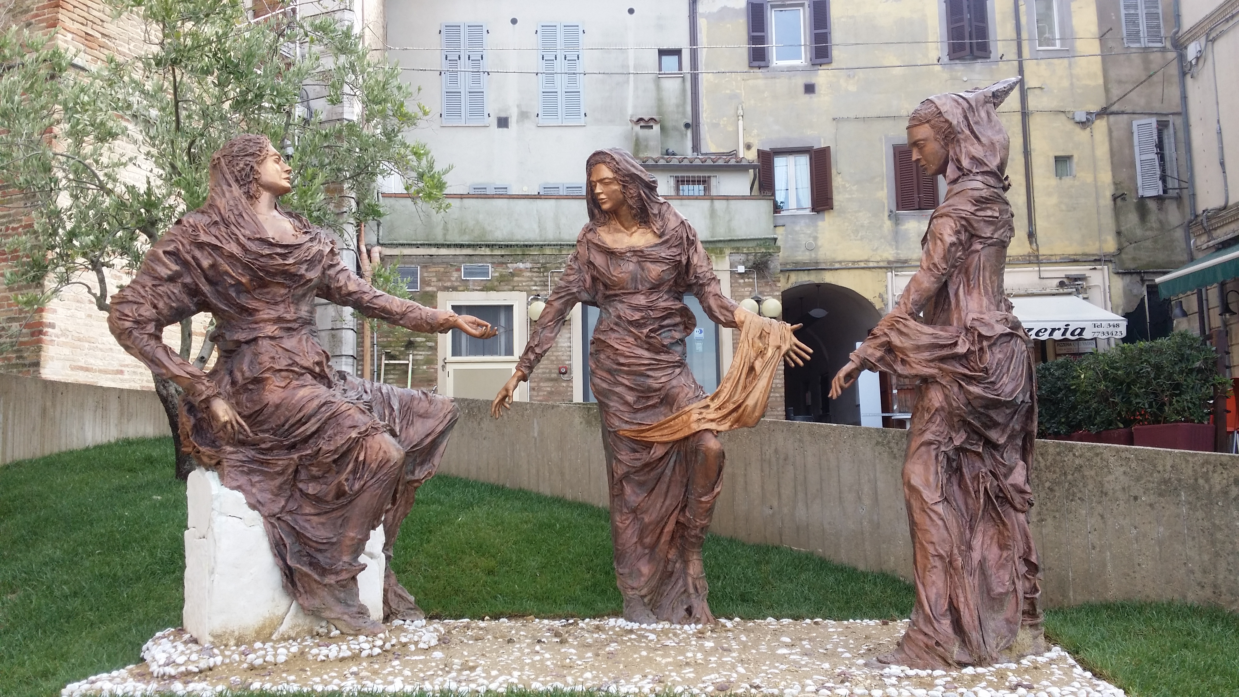 Quest’ultimo caso è disarmante. Lo scultore anconetano Floriano Ippoliti – immaginiamo col consenso dell’amministrazione e il nulla osta dell’arcivescovo – progetta per uno slargo tra pizzeria, fermata dei taxi, e specialità alla brace, un gruppo di tre statue bronzee (Maria, Elisabetta e – a sorpresa – sant’Anna) il cui panneggio effetto lingerie bagnata con strascico oltre i piedi, i veli tipo pennacchio strega-halloween, rendono il trio un’apologia involontaria del più sublime sgunz. Eppure sarebbe bastato vedere le “Due sorelle” di Picasso, per lasciar perdere.