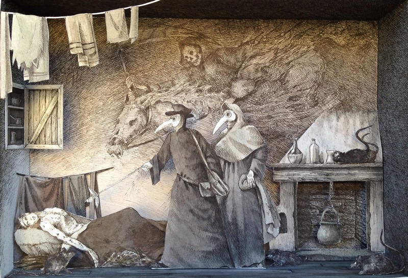 L’ultimo esito lavorativo della ditta รจ rappresentato dai diorami, piccoli “teatri” realizzati con la tecnica del paper cutting: disegno, china, acquerello e naturalmente forbice e colla e carta, tanta carta, per scatole magiche e “stanze” che attraverso l’artifizio del trompe l’oeil raffigurano storie e macrocosmi dalla fortissima valenza simbolica. Li potrete vedere a Milano, alla galleria Giuseppe Pero in zona Isola, dove fino al 29 gennaio รจ in corso la personale “Da Terra a Cielo“, lโinstallazione sito specifica di opere inedite che nascondono aneddoti e simbologie magiche di “un’sola nell’isola”: il Ghetto Ebraico di Venezia, di cui si celebrano oggi i 500 anni di storie e leggende. Qui la cronaca si intreccia con la ricostruzione immaginifica: i “monolocali” di Vanni Cuoghi raffigurano i giorni della peste, i rastrellamenti nazisti, il Golem e il sacrificio di Isacco, ma anche Corto Maltese e la Venere degli Stracci di Pistoletto.