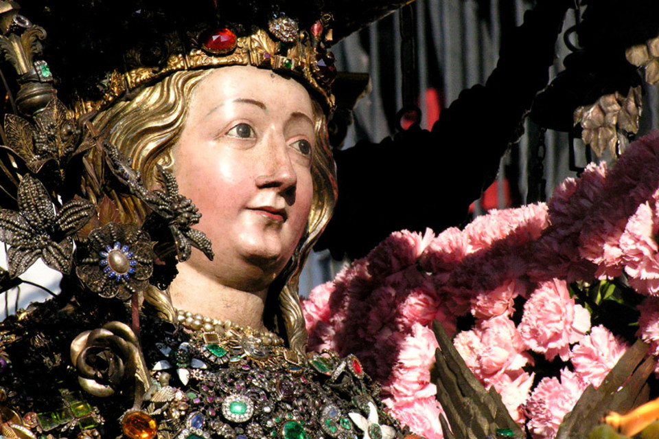 In capo, Agata porta tiara di stazza regale donata – così vuole a leggenda – da Riccardo Cuor di Leone in soggiorno a Catania al ritorno da una Crociata. In mano, una croce massiccia ingioiellata da rubini. Accecante come la protagonista di una pellicola di Perdro Almodóvar, sorridente come un’educata infanta blasonata, la santuzza esercita con potenza quasi tellurica un insolito intento di sorellanza fra le sue concittadine. Il martirio che l’ha elevata alla gloria degli altari è ancora talmente in superficie da essere una minacciosa metafora dei tempi che viviamo. Tutte possono legittimamente cercare nel suo serafico sguardo il conforto di cui hanno bisogno. Per aver messo in atto una forte ribellione contro il maschilismo romano nel secondo secolo dopo Cristo – degna di un’intrepida Pussy Riot nella Russia di Vladimir Putin – ad Agata sono state inflitte brutali torture. Proprio in ricordo dell’amputazione dei seni con delle enormi tenaglie – oltre alle glicemiche minnuzze nelle vetrine delle pasticcerie catanesi – la picciridda è stata da qualche anno nominata protettrice delle donne affette da tumore mammario. A sottolineare la simbolica corrispondenza fra il martirio della santa e quello che ogni donna subisce nel fisico e nel cuore quando esplode il male, nel calendario delle manifestazioni correlate ai festeggiamenti civili e religiosi non mancano le iniziative sulla prevenzione con relativo supporto psicologico.