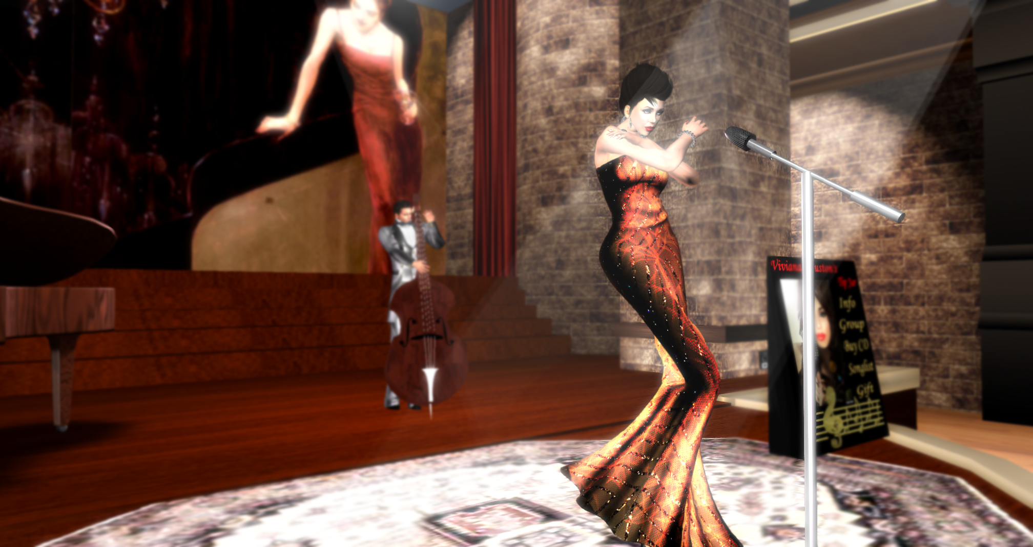“Perchè su Second Life ho la possibilità di regalare emozioni a gente di tutto il mondo che viene ad ascoltarmi a costo zero”, ci spiega. “Puoi esibirti in una bellissima Roma ricreata storicamente, puoi trovarti a Cannes, a Parigi, in America o chissà dove. Inoltre hai la grande soddisfazione che la gente s’impegna ad ascoltarti e applaudirti, godendosi pienamente il live, rilassata su una poltrona nella propria casa. Per me questa esperienza è stata una grandissima palestra”, continua Viviana. “Canto in Second Life da sette anni e posso tenere la voce allenata, senza il problema che si presenta nella vita reale quando, non avendo serate per un mese, devi allenarti comunque a casa ma senza pubblico”.