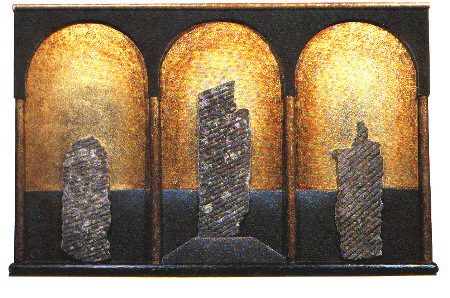 Qui Bencini ha sempre affermato di percepire energie particolari che l’hanno aiutato a partorire le sue opere, dove spesso e volentieri si rintracciano concreti elementi provenienti dalla citata regione. In questi lavori di pittoscultura infatti è molto presente la pietra serena di Cortona, dove l’artista va spesso per rintracciare le sue origini; queste e altre materie donano alle opere un sapore mistico, primitivo, elevandole a significati profondi che fanno parte della sfera umana e ultraterrena. Si tratta di opere studiate in modo molto preciso sotto il profilo geometrico e simbolico e fin dal primo impatto ci conducono verso un Mondo Altro, il quale ci pone in diretto contatto con Dio. Anche i colori utilizzati, formati anche in questo caso grazie all’utilizzo di elementi naturali, come la sabbia, ci fanno innalzare dalla nostra dimensione quotidiana per portarci in un universo parallelo. Una cromia molto cara a Bencini è per esempio quella contraddistinta da un nero luccicante, che venne in mente all’Artista un giorno all’Isola d’Elba, quando vide “Una spiaggia di sabbia nera, piena di vita per i luccichii ch’emanava”, colore che allo stesso tempo mette insieme l’ombrosità della morte e la brillantezza della vita ed è proprio da qui che nasce la poetica del pittore, detta “Arte Tetrista”, dove, per dirla con lui “Dal buio nasce la luce, dalla morte nasce la vita. Il perché? Tutto nasce da un recondito pensiero legato alla terra e al cielo”.