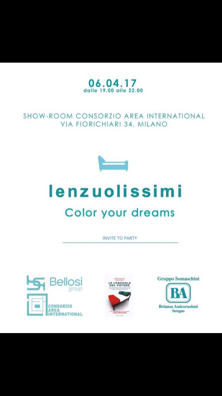 Tutto pronto questa sera per il party esclusivo di Lenzuolissimi – il marchio di qualità made in Italy, lanciato dal giovane imprenditore Michele Cascavilla, in queste settimane in vetta alle classifiche con il libro “Le lenzuola del potere” – in via Fiori Chiari n 34 dalle ore 19, in collaborazione con Bellosi Group e Axa Brianza Assicurazioni per il fuori salone 2017. Anche quest’anno il Salone del Mobile, giunto alla 56esima edizione, è al centro dei riflettori internazionali. Idea, creatività, innovazione e tecnologia sono i key concept della campagna che presentano il Salone del Mobile. Milano come un irrinunciabile appuntamento per conoscere, attraverso le tendenze progettuali avanzate, i nuovi modi dell’abitare.