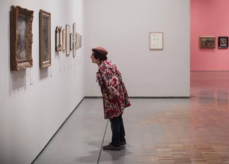 Una ragazza intenta a immortalare la Pala di Brera di Piero della Francesca in perfetta simmetria col dipinto. Una coppia accovacciata sul pavimento del Maxxi di Roma, sovrastata dall’opera di Anish Kapoor che pare amplificare i loro segreti. Un’anziana signora protesa in avanti quasi a voler entrare nelle tele di Balthus alle Scuderie del Quirinale.