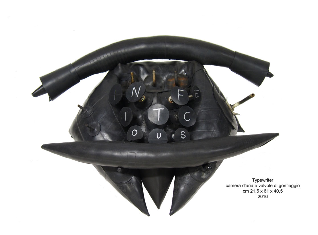 Home Luca Matti e il suo “supermondo” di uomini-molletta e città vertiginose Typewriter, 2016, camera d'aria e valvole,, 21,5x61x40,5 cm