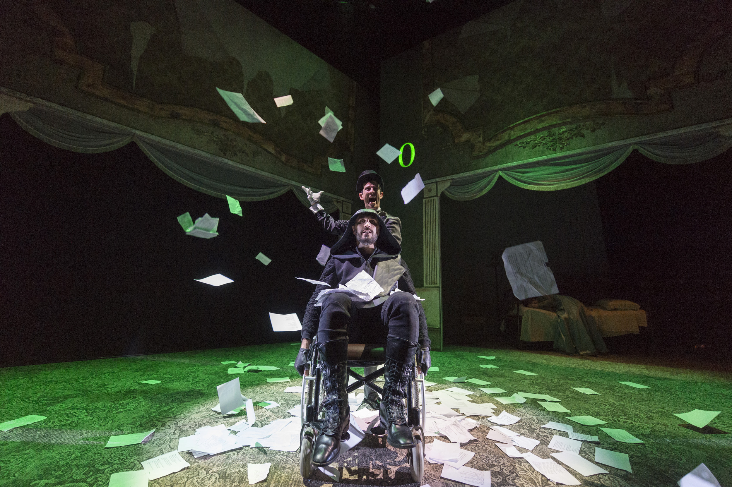 Quando si entra in sala, in proscenio, sono evidenti due scrittoi, posizionati simmetricamente e funzionali al gioco teatrale. Gabriele Russo, regista de Il giocatore, ha scelto di metter in scena subito una linea guida che caratterizza l’adattamento curato da Vitaliano Trevisan del romanzo omonimo di Fëdor Dostoevskij. Con l’apertura di sipario si scoprono le prime carte di uno spettacolo che rispetta l’originale vivacizzandolo con riferimenti all’oggi.