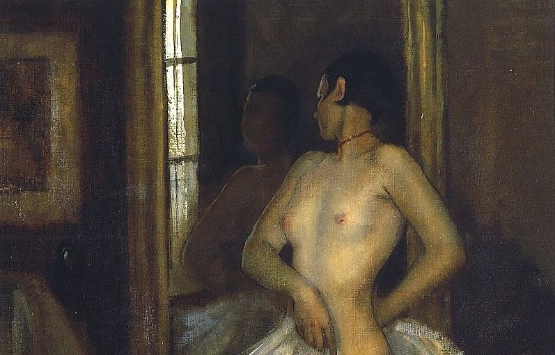 Un paio d’anni dopo, nel 1936, La prova, una ballerina androgina, snella e nuda, davanti allo specchio in un elegante boudoir. Tacchi alti da ballo, il sapore di una notte d’amore, la donna si drappeggia i fianchi con il gonnellino di pizzo. L’affascinante dipinto gareggia con i nudi francesi impressionisti e della Belle époque.
