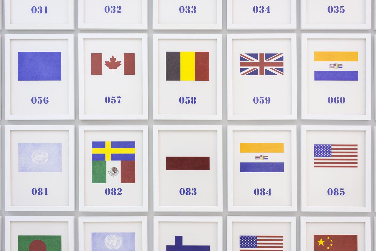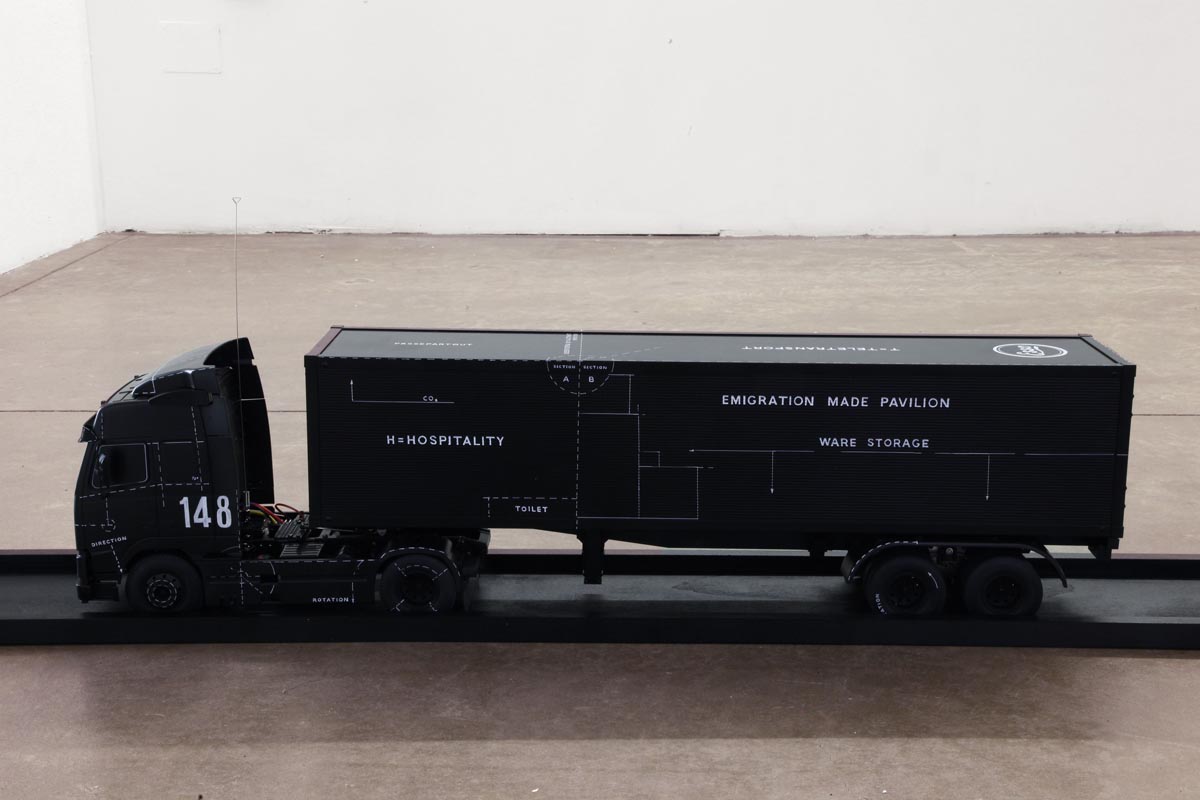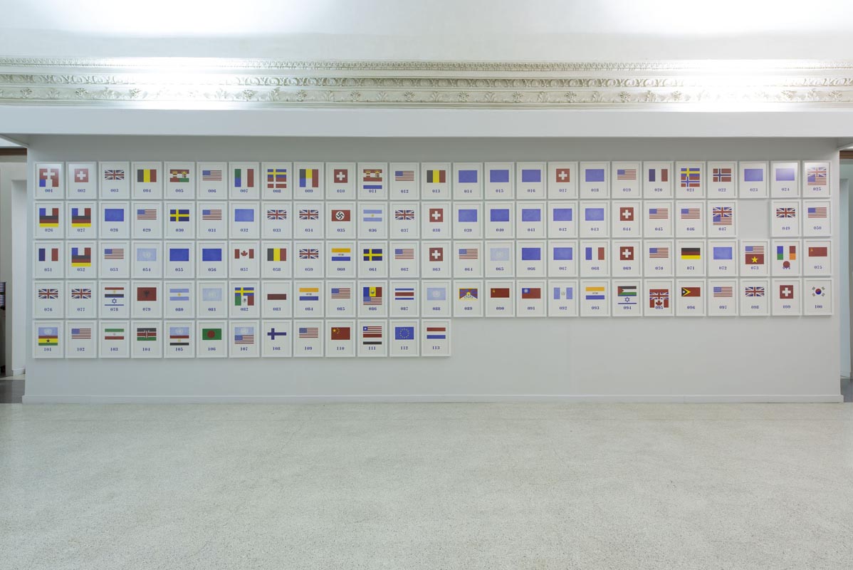Scendendo al secondo piano, è invece possibile visitare la mostra di Giuseppe Stampone (classe 1974, di un’altra generazione rispetto a Ugo La Pietra), focalizzata sulla riappropriazione del nostro tempo interiore, in una società che non sempre ce lo permette, tramutando i valori umani in meri simboli, attraverso l’imposizione di falsi miti. Per farlo, l’artista rielabora in chiave contemporanea quadri storici, toccando anche da vicino quello che è il fenomeno dei flussi migratori, tanto è vero che il lavoro più facilmente rintracciabile è l’installazione P-W Peace and War. Esso è lungo tredici metri e attraverso centoquattordici bandiere (tra cui anche quella nazista) ci ricorda i Paesi dei premi Nobel, denunciando così che anche alla base del conferimento del più importante premio internazionale risultano più importanti il potere e l’influenza di uno Stato, piuttosto che il rispetto dei valori fondamentali. Per terra notiamo un grande tir nero, con scritte che ricordano quelle pubblicitarie, che rimanda ancora più da vicino alla tematica dell’immigrazione, molto cara a Stampone.