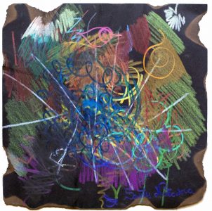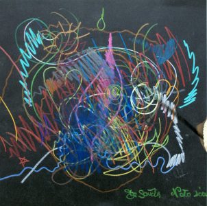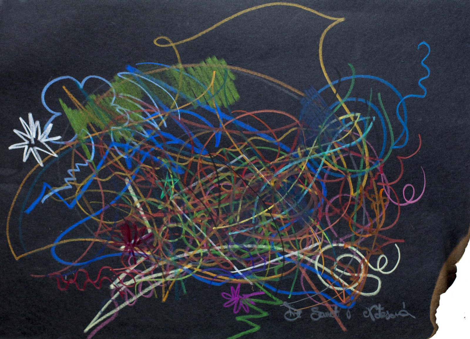 Disegno a mano ad occhi chiusi, matite colorate su foglio nero, senza titolo, 15×15, 18-05-2018