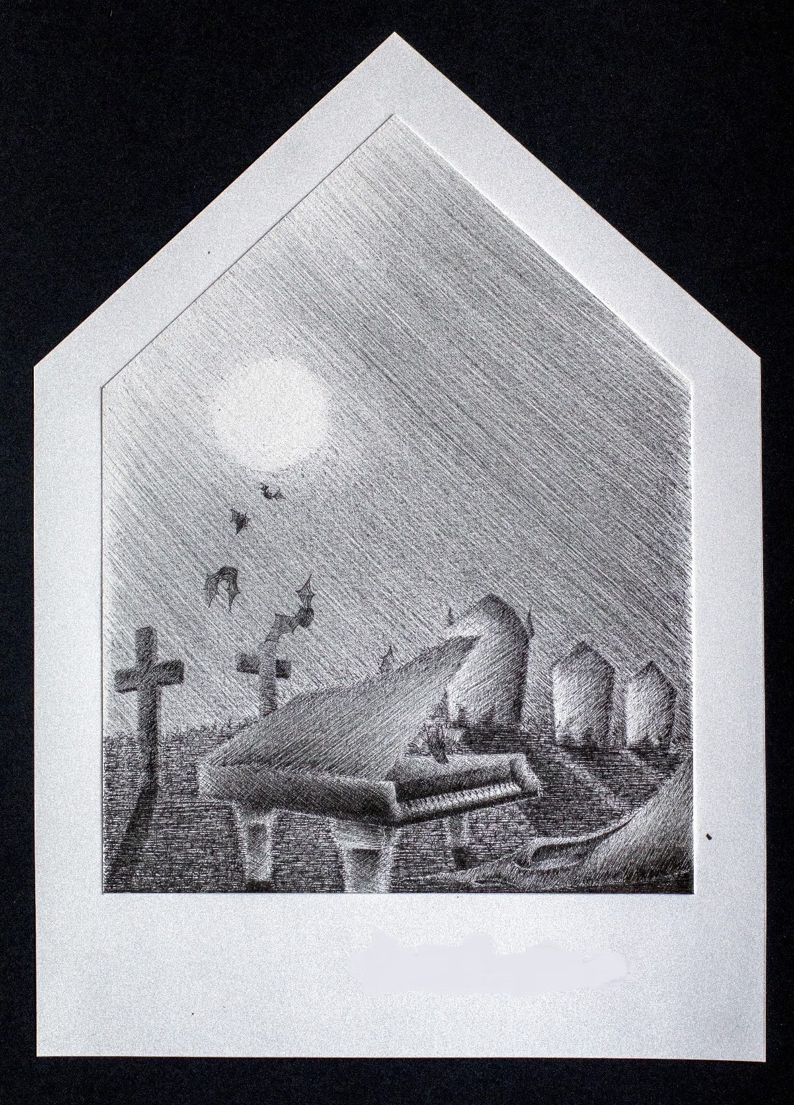 Disegno a mano, tecnica Rapidograph 0.1 B-N Morte e vita, mostra collettiva a Palazzo Baldoni di Montesilvano 25×40