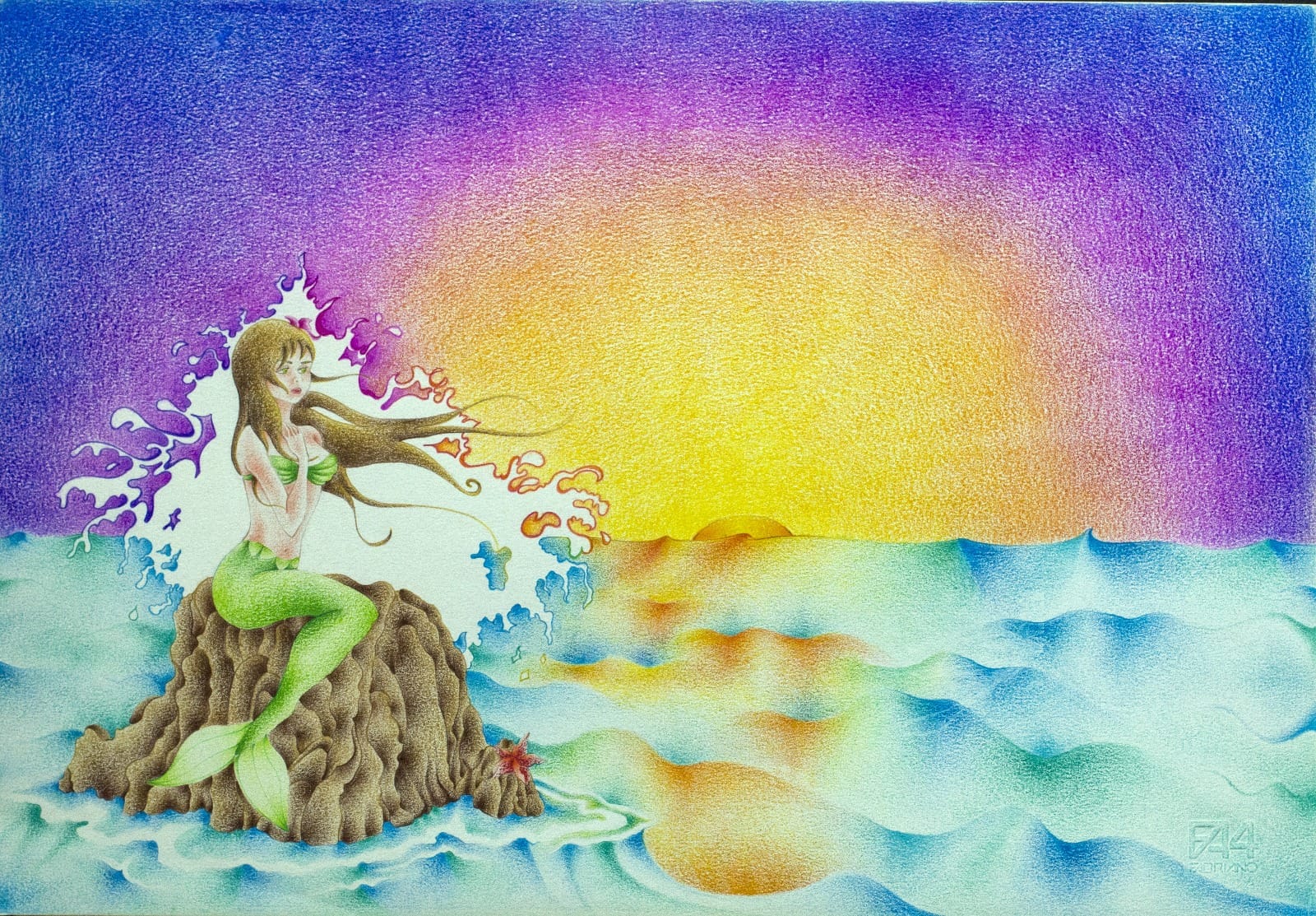 Disegno a mano, tecnica matite colorate La sirena 40×60