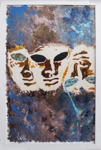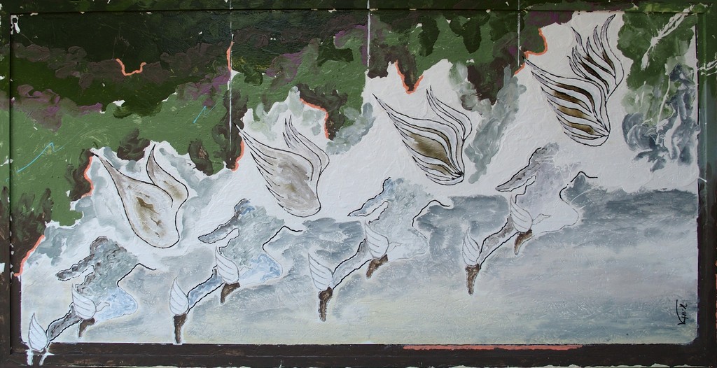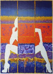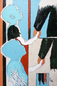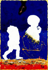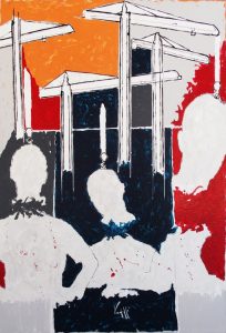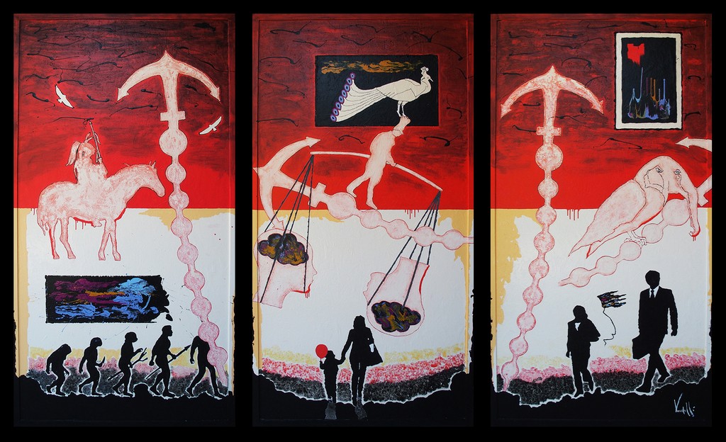 Altre esempio: ONIRICON, altra opera di dimensioni generose, un trittico su cui sfila davanti a noi la silhouette per eccellenza, quella che raffigura l’evoluzione dell’uomo a partire dalla scimmia, passo evolutivo dopo passo evolutivo, affiancata nel pannello centrale dalla coppia della vita madre/figlio, alla quale succede, nel terzo pannello, la rappresentazione dell’organizzazione produttiva per eccellenza della vita(ccia) oderno: niente scimmie, niente uomo cacciatore, niente mamma col bambino, bensì l’uomo in giaca e cravatta – colletto bianco con la ventiquattrore –ma di fianco c’è qualcuno scanzonato con un aquilone.
