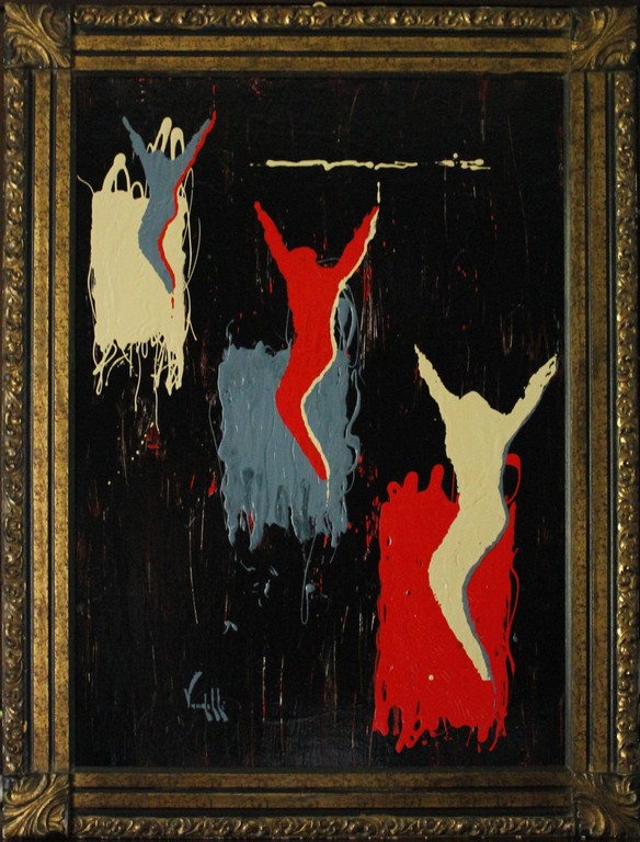 I tre pannelli sono sormontati dall’universo dell’immaginario, che solo Marcello Vandelli conosce: strani esseri, fra cui un curiosissimo volatile/elefante appollaiato su una specie di àncora, mentre sopra, in ogni pannello del trittico, torna il rosso, che insieme al nero delle silhouette dev’essere fra i colori prediletti dall’artista.