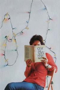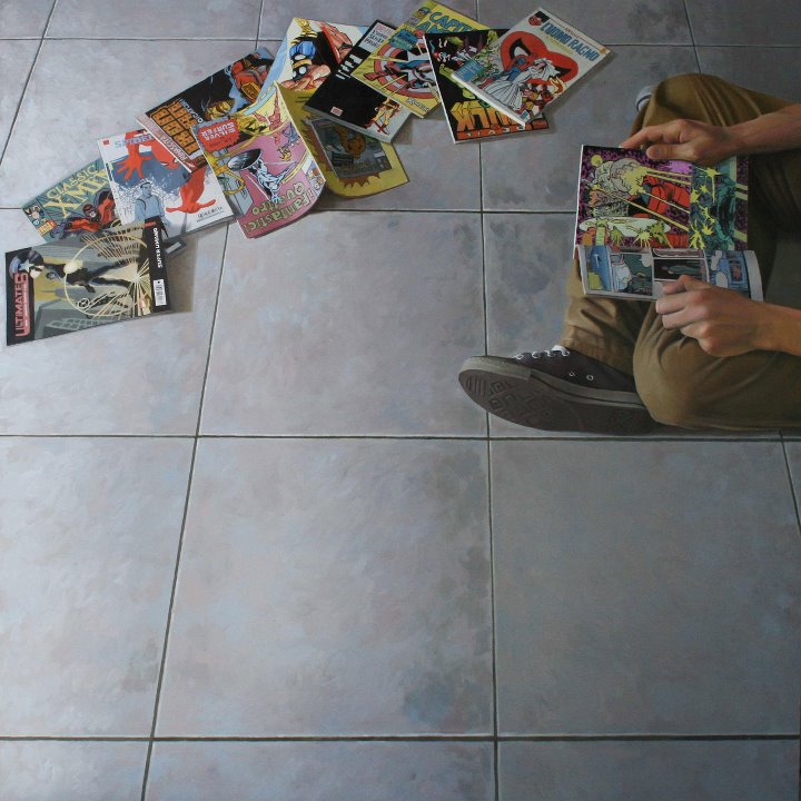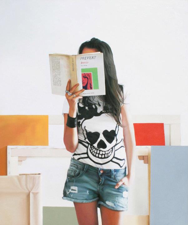 Ebbene, molto prima, qui in Italia, nel piacentino per la precisione, il pittore Davide Corona (Piacenza, 1981) realizzava ed esponeva in diverse gallerie d’arte in occasione di mostre personali e collettiva una serie pittorica, realizzata con uno stile “più-vero-del-vero” ma che non scadeva mai nel vuoto e meccanico virtuosismo, in cui i volti dei soggetti ritratti affondavano, come in un lago di ricorsività figurativa, nella copertina del libro che stavano leggendo.