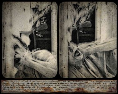 Da cineasta trasfigura l’immagine come un’inquadratura filmica, un fotogramma à la Psycho di essere e non essere, morte e vita, alfa e omega, secondo modelli archetipici attuali fra presente e passato.