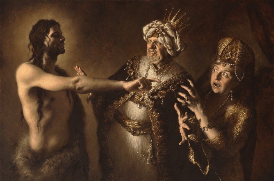 Giovanni Gasparro, Amoris laetitia. San Giovanni Battista ammonisce l’adulterio di Erode Antipa ed Erodiade. Olio su tela, 100×150 cm, 2017