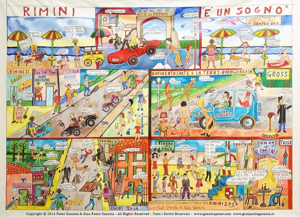 Peter Gazzola ha anche una certa verve ironico/polemica, non tanto sullo…stato/dell’arte/dell’arte, ma sullo stato di cose nel mondo là fuori, foss’anche la provincia riminese: guardare (e leggere) le opere Rimini è un sogno (2014) e Italian Parliament (2013), olii su tela dal forte impianto illustrativo che nei suoi quadri più recenti (2018/19) si sono evoluti nella raffigurazione di soggetti di volta in volta mitologici, biblici, arcaici, pastelli a olio con abbondanza di foglia d’oro, opere che ripropongono quel “primitivismo millenario” che è la firma di Peter Gazzola.