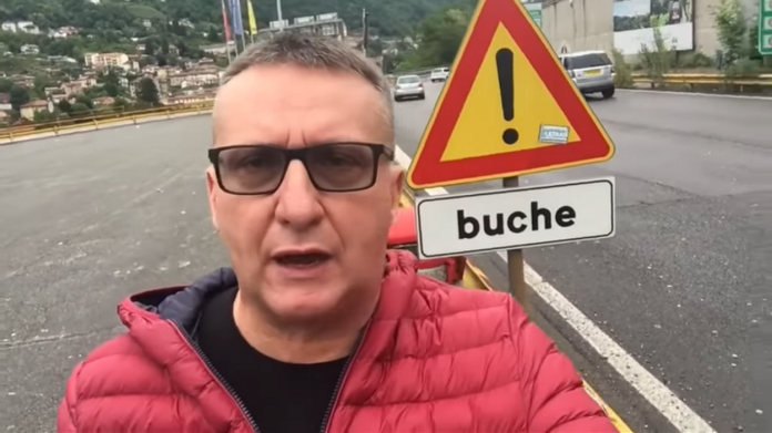 Ecco, chi di noi non ha mai fatto un trasbordo al valico di Chiasso? Confesso che non mi sono mai accorto della situazione di degrado in cui versa il confine con la Svizzera: ascoltando e guardando il video di Lambrenedetto ci si vergogna di presentarsi “agli altri”: non dico sembri Beirut, ma la videocamera testimonia lo stato di abbandono della frontiera italiana, fra voragini sull’asfalto, guardaril divelti, buche tappate con blocchi di marciapiede, immondizia e cartelli stradali piegati.
