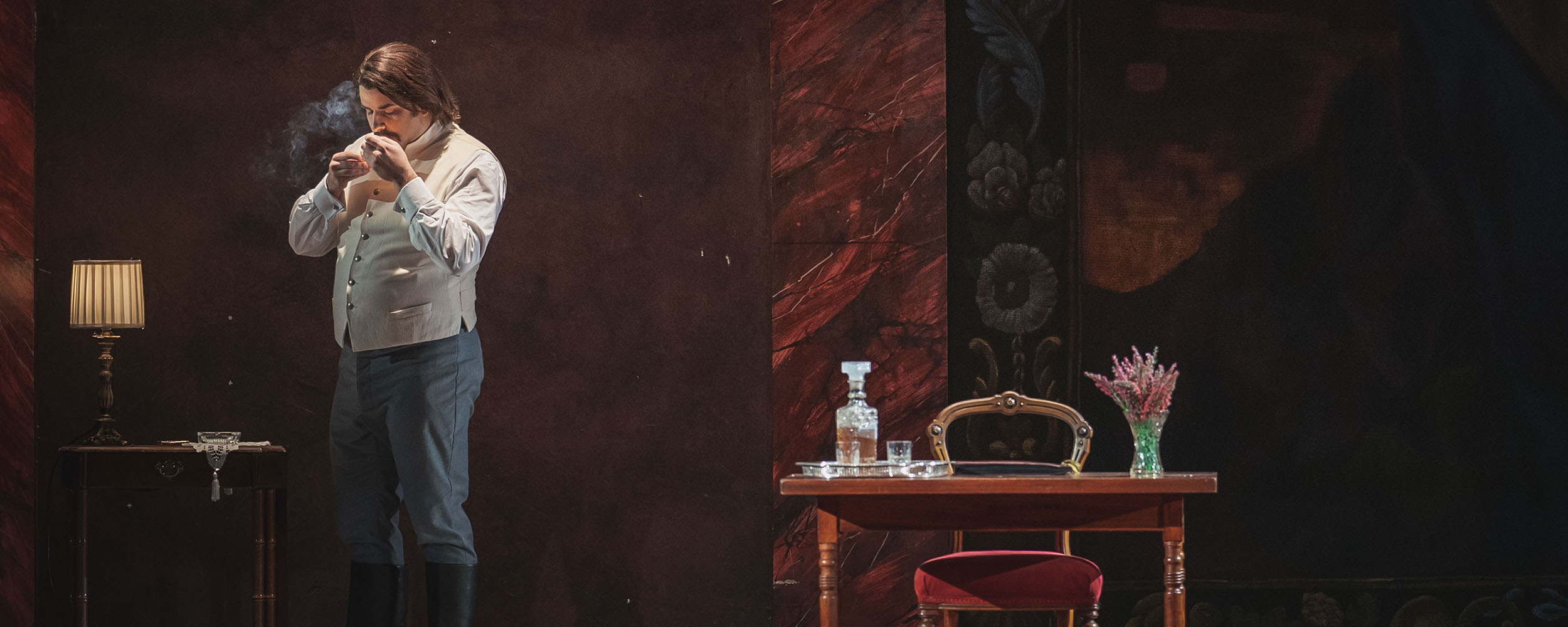 La regia di Rosetta Cucchi è organica e i tempi scenici sono pienamente rispettati. Sono emblematiche le scene di Tiziano Santi, asciutte e astratte, straordinariamente evocative, giocando sul doppio piano della scena e passando dall’arredo quotidiano e elegante del primo atto, con un bel quadro sul fondo, alla Siberia bianca, geometrica e concettuale del quarto atto.