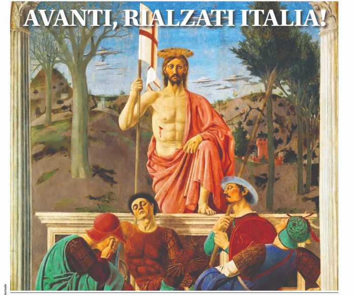 La Resurrezione, il capolavoro di Piero della Francesca, che si può ammirare al Museo Civico di Sansepolcro, ci è sembrata l’immagine più significativa per raccontare questa pagina della nostra storia, che rimarrà incisa nel marmo di questa nuova epoca che si sta affacciando così violenta ed improvvisa. E noi italiani che, da 80 anni a questa parte, siamo abituati a sventolare il tricolore solo per una partita di calcio e a protestare con veemenza quasi solo a comando, siamo spaesati e inebetiti, restiamo increduli. Proprio come loro, quei quattro Romani dipinti nell’affresco, inginocchiati di fronte al Cristo che si leva dal sepolcro e risorge verso la vita. Eppure, nei momenti più bui ci siamo rialzati.