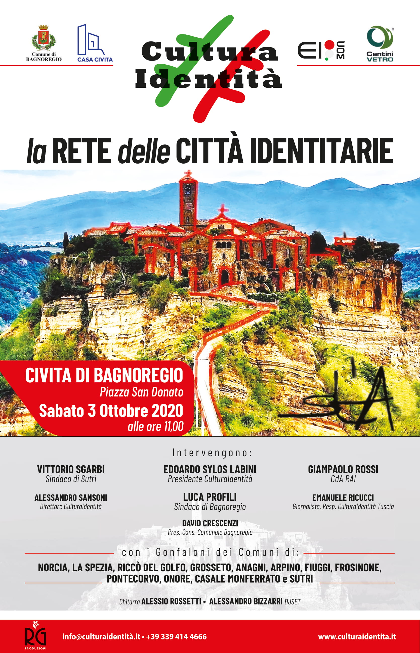 Valorizzare le nostre aree interne e riscoprire la forza dell’identità delle nostre città. E’ l’obiettivo dell’appuntamento in programma a Civita di Bagnoregio il prossimo 3 ottobre alle ore 11 organizzato dal movimento culturale “CulturaIdentità”. Un confronto dialettico costruttivo e frizzante che vede la partecipazione del fondatore di CulturaIdentità, Edoardo Sylos Labini, del critico d’arte Vittorio Sgarbi e del componente del CDA Rai Giampaolo Rossi. Con loro il primo cittadino di Civita di Bagnoregio Luca Profili, il direttore del mensile CulturaIdentità Alessandro Sansoni, lo scrittore Emanuele Ricucci.