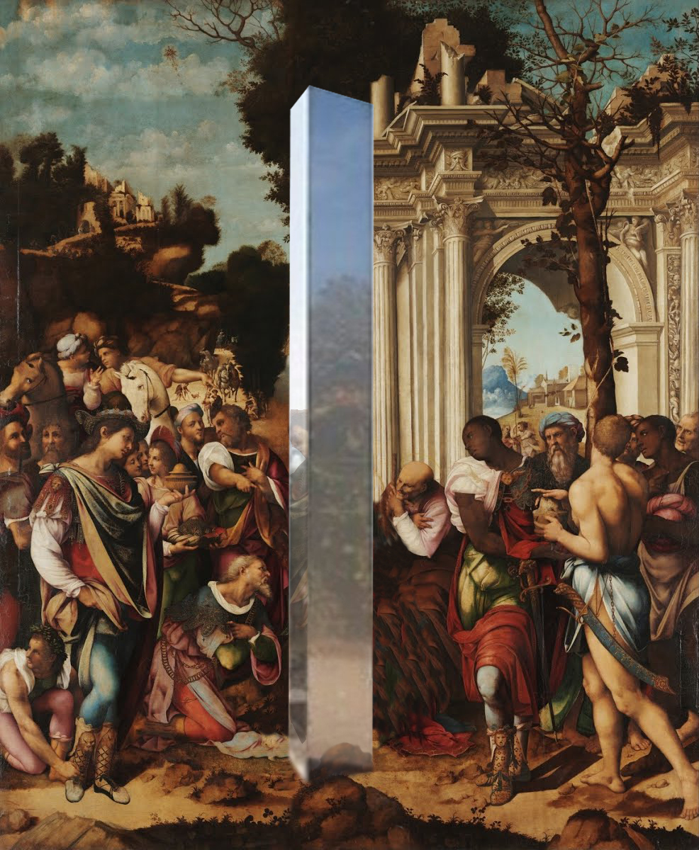 E proprio qui stiamo in medias res: si tratta di dieci quadri di grandi capolavori di maestri del passato (da Giotto a Botticelli, dal Bramantino a Dürer, passando per il Parmigianino, Cesare da Sesto e Beato Angelico) che, anziché adorare il Bambin Gesù, restano fissi a guardare la propria immagine riflessa in un monolite che Felipe Cardeña ha collocato proprio al centro della scena.