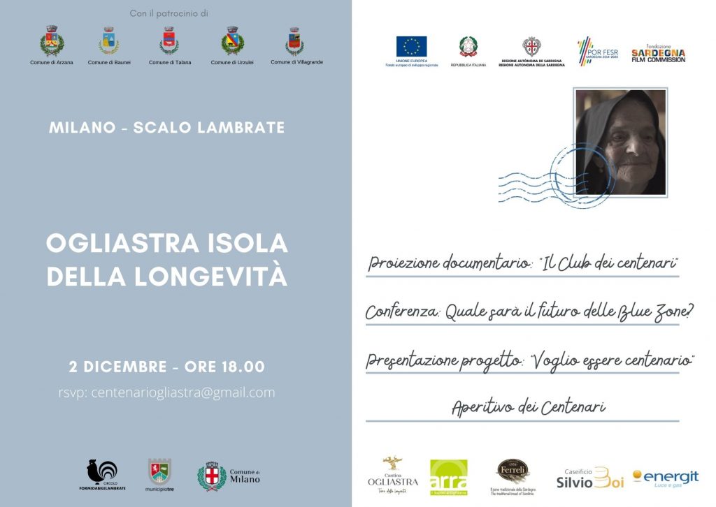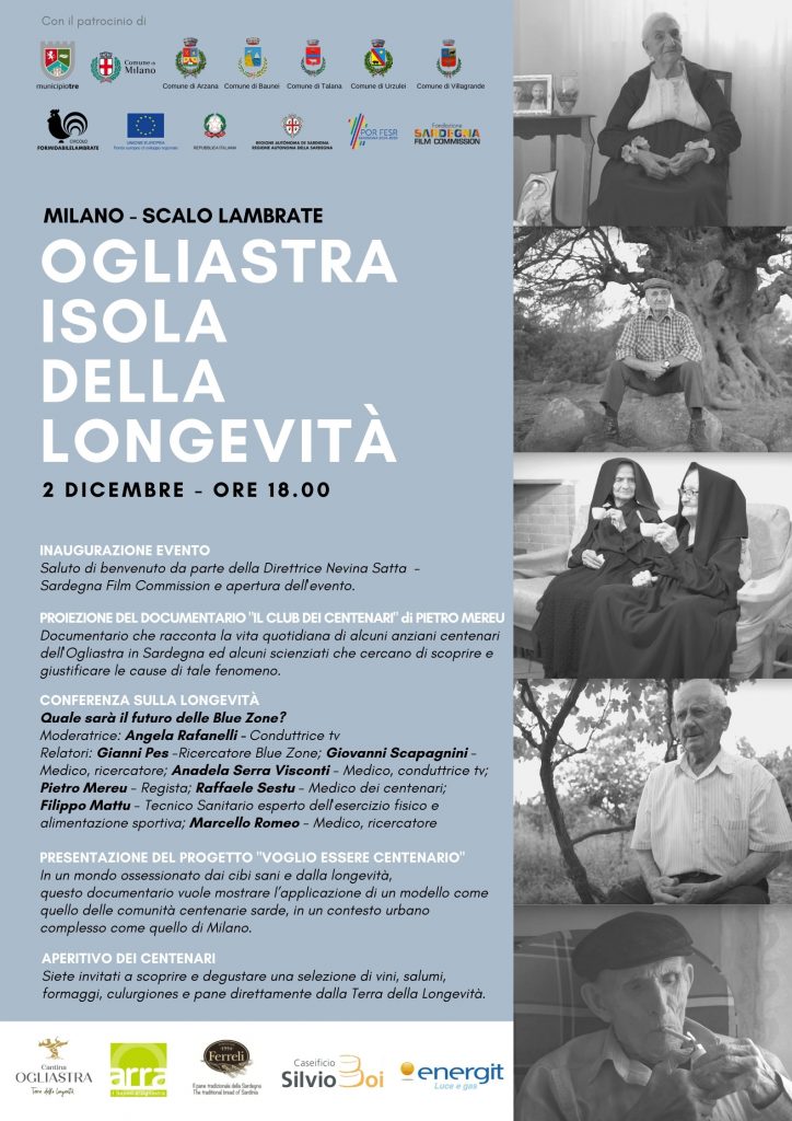 L’Ogliastra è una delle cinque Blue zone al mondo. Il regista Pietro Mereu ha viaggiato tra i paesi di Arzana, Baunei, Talana, Urzulei e Villagrande Strisaili, in Ogliastra, una delle zone più isolate della Sardegna, per conoscere il popolo di ultracentenari che la abitano e documentare tutte le testimonianze. I centenari ogliastrini, una delle percentuali più alte al mondo, vivono la loro esistenza in modo semplice, godendo del clima favorevole della zona e vengono puntualmente raggiunti da medici da ogni parte del pianeta che cercano di scoprire il segreto della loro longevità. I locali di Scalo Lambrate, a Milano, ospiteranno l’iniziativa “Ogliastra- Isola della Longevità”, dedicata ai centenari, che si terrà il prossimo 2 dicembre.