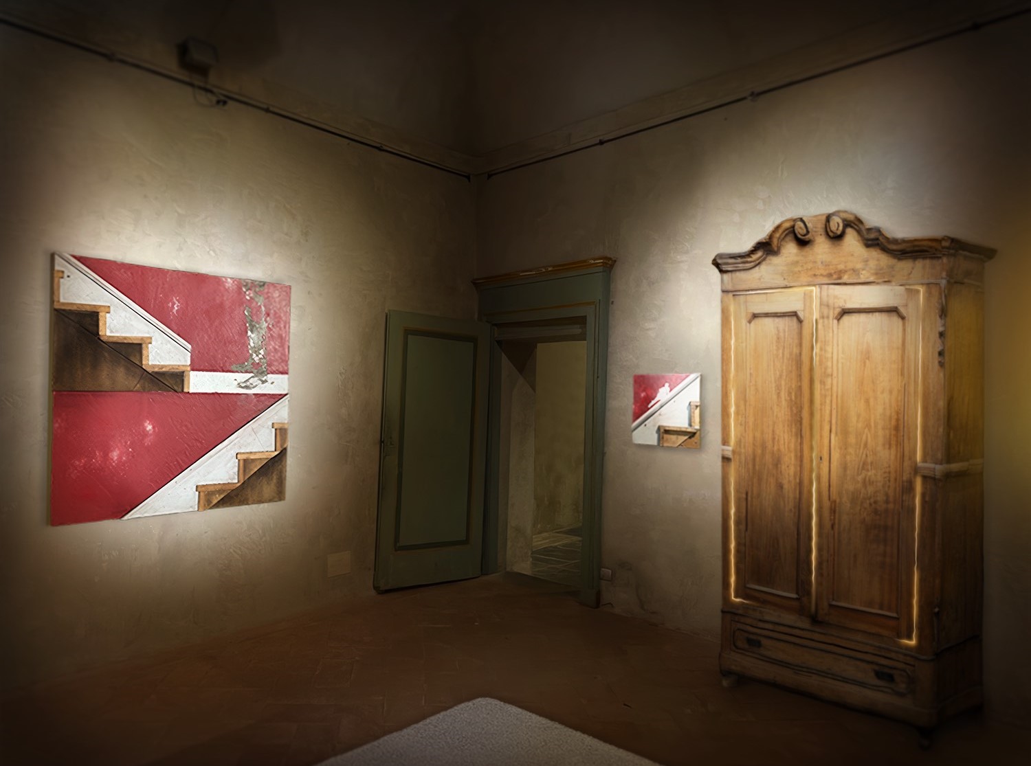 L’intera mostra è costruita sul registro del mistero, del segreto, del disvelamento: le quindici opere pittoriche, realizzate dall’artista, oltre ad essere state esposte sulle pareti, sono state celate all’interno di questo set architettonico e lo spettatore è chiamato a uscire dall’apatia del suo stato di fruitore passivo, per vivere in diretta un’esperienza partecipativa e immersiva.
