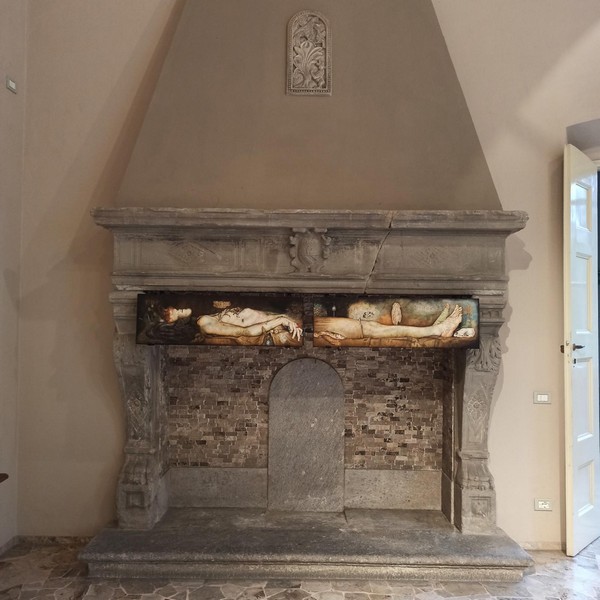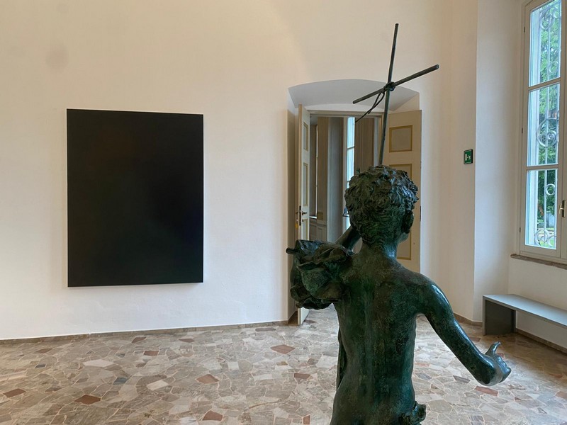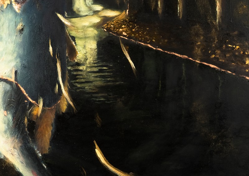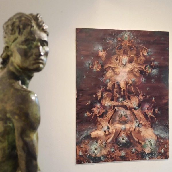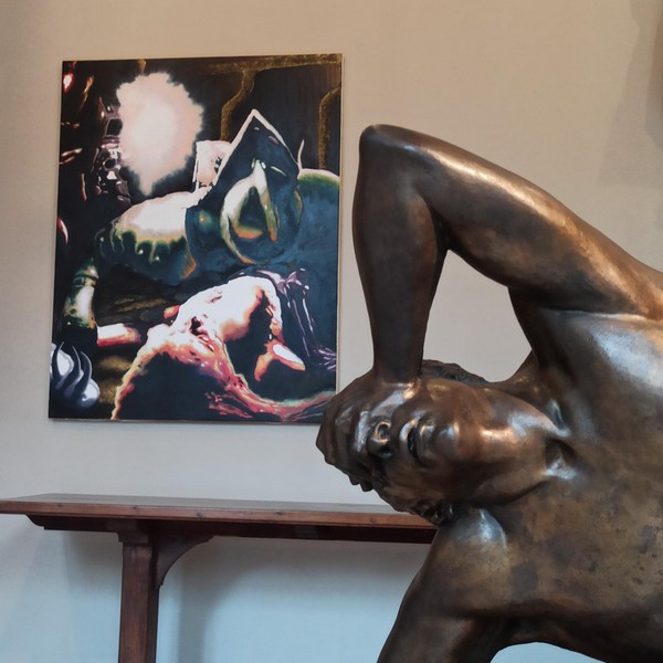Vedere il mio lavoro esposto nelle splendide sale di Villa Clerici accanto a grandi artisti del passato mi emoziona“, racconta Vittorio Zeppillo, giovane artista multidisciplinare marchigiano che oggi vive e lavora a Milano. “Fino ai vent’anni ho militato in ristoranti di alta cucina, di arte contemporanea non ne sapevo proprio nulla, ma amavo creare piatti pensando alle cromie e alle provenienze dei prodotti. Poi ho iniziato a sperimentare direttamente con la pittura e ha studiato decorazione all’Accademia di Belle Arti di Urbino“. Per l’esposizione a Villa Clerici presenta due oli su tela, La Caduta e Il Gambetto danese in dialogo di presenze e sguardi con la scultura di un Cristo esausto a terra. Quasi a ravvisare ,fra pennellate concitate e secco- pastose , una visione onirica (il desiderio?) di una nuova grande “sacralità” che sta ridestandosi in modo spasmodico. Forse nel mondo, ma sicuramente rimanda a una parte profondamente personale dell’artista.