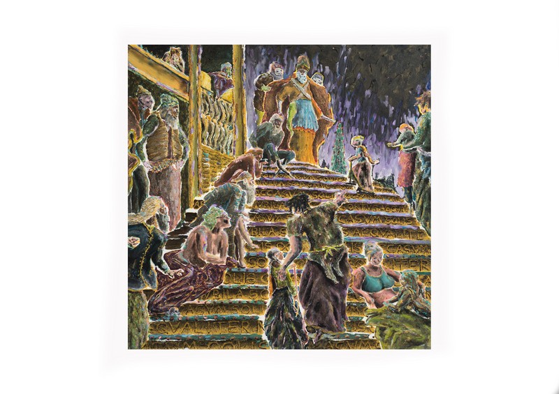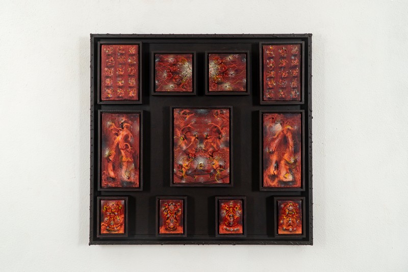 Andrea Luzi, un artista visivo con un background variegato, nel writing e nella musica, presenta due lavori: Se la vita ti sorride ha una paresi, un olio e vernice spray su tela dall’esplicita intenzione ironica e provocatoria e La grandezza del nulla pt.2, un polittico in olio e colore per vetro su lino in una cornice in legno. È una visione distopica, allucinata e dai toni drammatici, quella che si apre ai nostri occhi: mondi visionari e cupi, figure contorte, di ardua decifrazione, in cui disordine, paura e angoscia regnano sovrani. In cui cogliamo un senso di vertigine e di spaesamento simile a quelle delle nostre vite, generato dalla nostra dall’incapacità di progettare nuovi futuri di pace e rispetto per il pianeta terra. Una sorta di attualizzazione del bestiario dei demoni dipinti da Hieronymus Bosch, figure grottesche. angeli trasformati in insetti e teschi spaventosi, pesci che hanno abbandonato l’acqua per vivere sulla terra, esseri umani con le schiene inarcate dallo sfinimento, avvolti dalle fiamme. dell’Infermo.