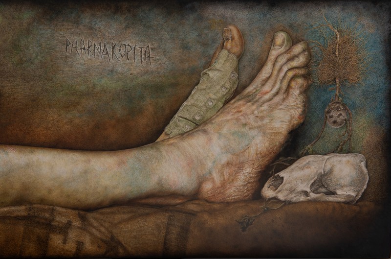 ll corpo come territorio del sacro. Non lascia indifferenti il lavoro di Enrica Berselli, laurea con lode in Lettere Moderne a Bologna e in Arti Visive presso l’Accademia di Belle Arti di Brera, con una tesi sulla ritualità iniziatica e funebre nell’arte contemporanea. Espone per la prima volta l’opera Pharmakopita, un olio su tavola che nasce da una ossessione (cosi la definisce la stessa artista) per Il corpo di Cristo morto nella tomba, una delle opere più famose di Hans Holbein il Giovane (dipinto nel 1522). “Feci anche un viaggio anzi un pellegrinaggio a Basilea, per vederlo al Kunstmuseum dove è conservata la tela. Il duro realismo di quel corpo a grandezza naturale, emaciato, sofferente, con tutti i segni della morte addosso, a partire dalle dita già livide, l’espressione terribile del volto, i capelli rigidi, le ferite nella carne secca, le mani rattrappite, continua a tormentarmi e ancora mi sconvolge”. Il dipinto di Berselli è un accumulo di simbolismi e si ammanta di nuovi oscuri significati (“ma non li dirò”) spunta anche una chiave, gli occhi sono coperti dalla maschera da falconiere. “Ho usato lo stesso legno di tiglio del dipinto di Holbein, uguali anche le dimensioni (30.5 cm x 200 cm, n.d.r.) , però ho sentito subito che doveva essere tagliato a metà“, lasciandone aperto il simbolismo di questa scelta. Il dittico, espressione tradizionale di arte sacra, vuole mostrare con evidenza il legame con il senso del sacro? Oppure simboleggiare la scissione fra corporeità e spiritualità, istinto e ragione? E forse, perché no, “è anche la donna tagliata in due nella scatola dell’illusionista“, provoca divertita l’artista. La seconda opera esposta dall’artista modenese è Guyon o della Mano Benedicente scultura in cera vergine d’api, pigmenti, ferro. “Prende il nome, ci spiega Berselli, dalla sindrome del canale di Guyon, un tipo di neuropatia che obbliga le ultime due dita della mano a stare aderenti al palmo in una posa che ricorda il gesto della mano benedicente. L’opera si colloca in quella zona grigia fra scienza e fede, mostrando come il corpo può essere trasformato in burattino da una concreta lesione dei nervi, fili tesi invisibili, conseguendo la fissità di una posizione a cui molti attribuiscono significati ulteriori, così come alle lacerazioni interpretate come stigmate e al sangue versato attraverso stratagemmi da ciarlatani“. La perpetua mutazione dei corpi attraverso la pelle, luogo simbolico di comunicazione fra ciò che è interno e invisibile e il mondo esterno.