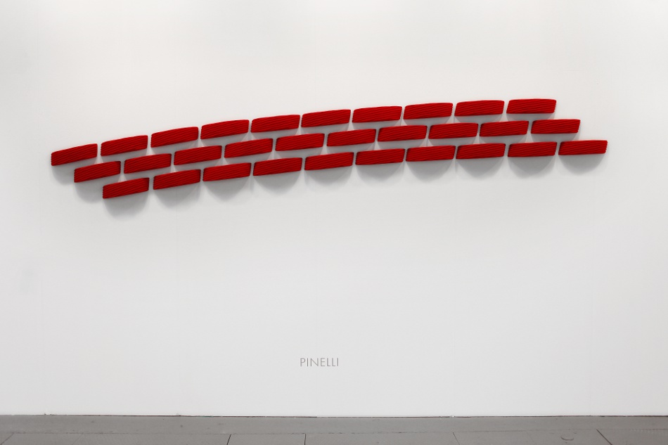 Superfici monocrome concentrate sui colori bianco, giallo, blu, grigio e un vibrante rosso, forse il colore che più caratterizza Pinelli, intendendolo, secondo le sue stesse parole, come “due colpi di tamburo” e ottenuto mescolando cinque diverse tonalità di rosso cui nel 2015 la galleria Dep Art di Milano dedicò la mostra Antologia rossa.