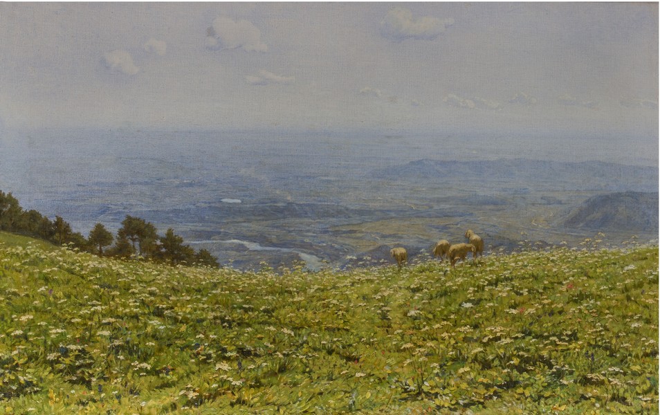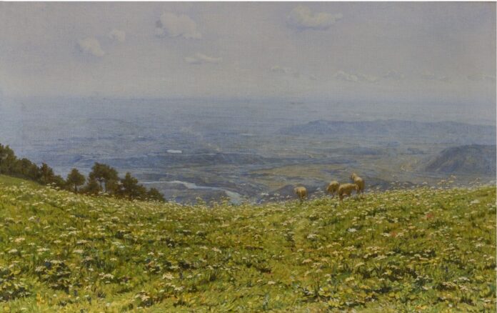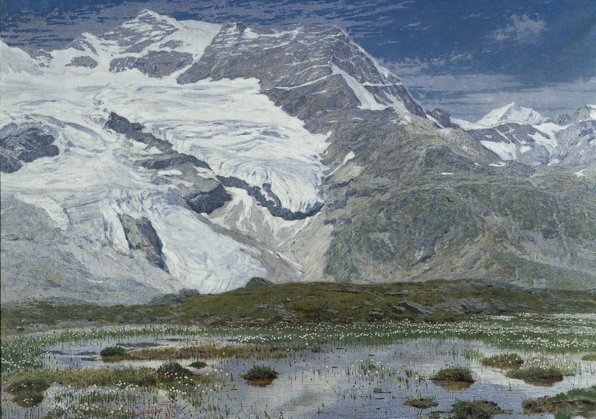La solennità imperturbabile della natura, ne Il ghiacciaio di Cambrena (1897) nello svizzero Canton Grigione dipinto da Filippo Carcano (fu allievo di Hayez all’Accademia di Brera) dove la massa potente dei seracchi di ghiaccio si riversa in un laghetto punteggiato di candidi , teneri piumini degli eriofori. E ancora di Carcano Arses (1895 circa: in primissimo piano un soffice prato disseminato di fiorellini bianchi vibranti di luce, con un intreccio finissimo di pennellate E poi ampliando la spazio della visione un susseguirsi di valli che sfumano nell’ immensità della pianura, in un graduale rarefarsi della materia pittorica, dando forma a un sentimento poetico. Quanta pace trova l’anima dentro un paesaggio che nella sua sconfinata ampiezza si apre , in un momento unico e irripetibile, all’esperienza dell’infinito, a una sorta di panteismo cosmico.