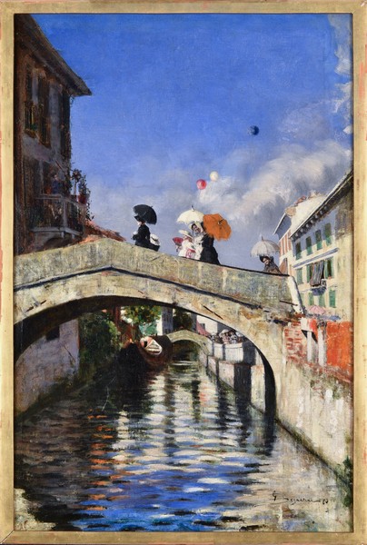 Infine scorci come quello di Mosè Bianchi, La prima neve (1890) una neve segnata dalle ruote dei carri che ne percorrono le vie e sporca del fango al quale si mescola. L’atmosfera gioiosa, gli abiti eleganti, i leggiadri ombrellini e i palloncini che si librano nel cielo del dipinto Il Naviglio a ponte San Marco”, ancora di un Segantini, ventiduenne. E sembra di stare lì, a respirare la poesia di atmosfere lontane, nella pienezza di una giornata di sole che illumina calda e brillante la struttura muraria del ponte.