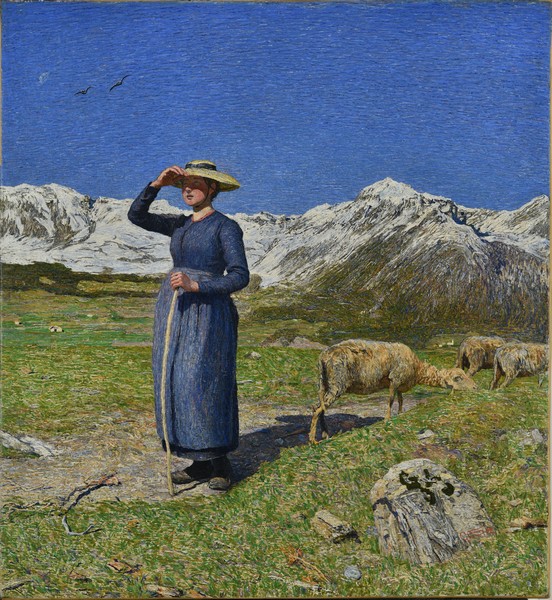 Ce ne sono tanti di quadri a soggetto alpino in mostra. Mezzogiorno sulle Alpi (quadro simbolo della locandina della mostra novarese), di Giovanni Segantini ritrae una pastora in piedi (la modella Baba, la giovane che aiuta la famiglia Segantini nelle faccende domestiche) che si volge verso territori inesplorati, con delle pecore che vagolano attorno. Un prato sotto il sole di una giornata limpidissima in piena estate, a 2500 metri di altezza che esplode della radiosità della luce. alpina. Sullo sfondo le montagne engadinesi spolverate di bianco, che si stagliano contro un cielo blu intenso riflettono la purezza dell’aria. Gli uccelli in volo richiamano un impercettibile movimento nell’aria sovrastata dal silenzio . Chi non vorrebbe essere lì? In quella luce sfolgorante, nel chiarore cristallino di quella luce che conferisce alla veduta un senso di infinito ? Nel corso della sua vita Segantini è salito sempre più in alto alla ricerca di una luce sempre più pura, a un passo dal cielo. Scruta la montagna, la contempla, ne sente la spiritualità e la potenza. eleggendola a luogo della mente capace di lenire ogni dolore (morì giovane, a soli quarantun anni, sul monte Schafberg, a 2731 metri dove si era rifugiato per portare a termine il suo Trittico delle Alpi). Per esaltarla, lui la natura doveva respirarla, doveva viverla fisicamente.
