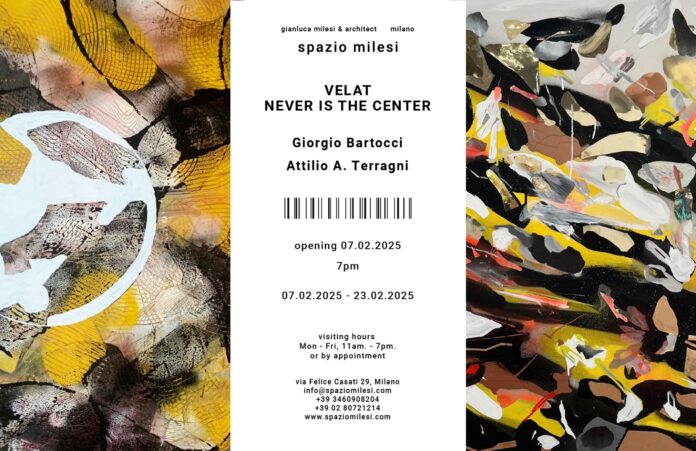L’arte si presenta come una mappa di segni che attraversano e si trasformano in una rete infinita, in cui l’astrazione diventa il linguaggio che unisce tutti gli elementi della Natura. La mostra, quindi, invita lo spettatore a considerare come la nostra esistenza si inserisce in un flusso di “coincidenze spazio-temporali” che ci trascendono e al contempo ci definiscono. Giorgio Bartocci è un artista che esplora la relazione tra l’uomo e il territorio, diviso tra urban-art e product-design. La sua ricerca si concentra sulla tensione tra le complesse strutture urbane e le dinamiche sociali, dando vita a opere astratte e figurative che raccontano la “modernità liquida”. Tra sfumature, sovrapposizioni e segni evocativi, le sue opere riflettono la condizione umana in una società in continuo mutamento. Bartocci, che ha studiato progettazione grafica e comunicazione visiva, vive e lavora a Milano. Attilio A. Terragni, sviluppa la sua carriera artistica a partire dagli anni Ottanta, con opere che spaziano dalla geometria all’astrazione. Il suo lavoro si caratterizza per l’esplorazione del corpo e della memoria, con progetti come “After Geometry”, “Le ore invisibili” e “Rough-hew”. Con il progetto “Velat Never Is The Center”, Terragni indaga l’armonia prestabilita e l’esistenza come una sostanza chiusa in sé stessa. Le sue opere sono una riflessione sulla condizione della monade e sulla continua ricerca di un centro che non esiste.