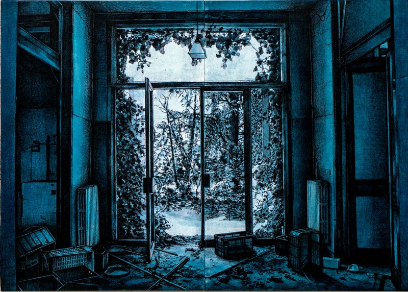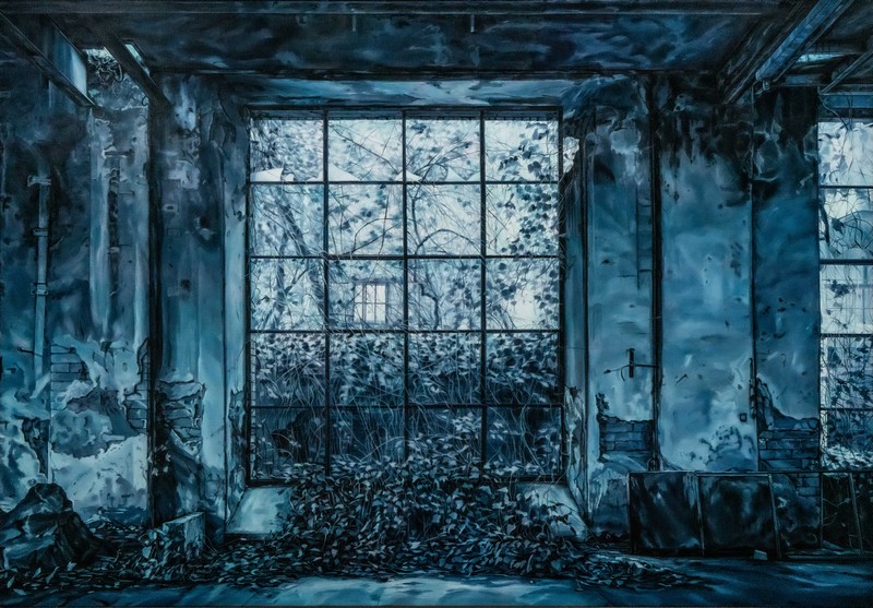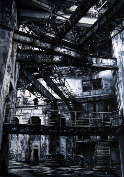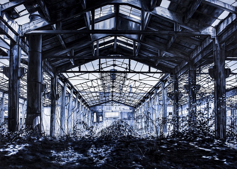 Dalle prime figure a inchiostro nero (“Nero” era il titolo della personale del 2005) al disegno, alla matrice grafica del tuo lavoro, passando alla pittura figurativa realistica -quasi fiamminga- o vicina alla Nuova Oggettività tedesca per precisione dei dettagli, documenti architetture e paesaggi urbani postcontemporanei, e ti distingui per una iconografia romantica del ‘rovinismo, tipo vedute di Giambattista Piranesi per capirci, ma ti interessano ancora gli spazi vuoti e abbandonati di archeologia industriale, sempre più rari, perché?