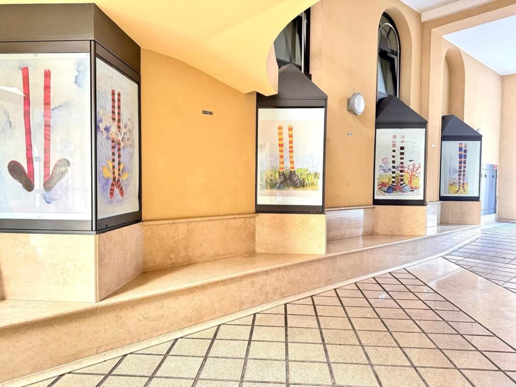 Il percorso visivo parte dalle vetrine urbane del MIMUMMO – Micro Museo di Monza, che diventano quinte sceniche per queste presenze sfrontate. Spuntano dietro i vetri come marionette ingovernabili, ora vestite di righe verticali rosso fuoco, ora immerse in paesaggi marini con coralli e anemoni, ora adagiate in un prato verde. L’effetto è straniante lo spettatore si ritrova a fare i conti con gambe più grandi di lui, che sembrano muoversi davvero, con un passo che è ora danzante, ora goffo, ora teneramente buffo.