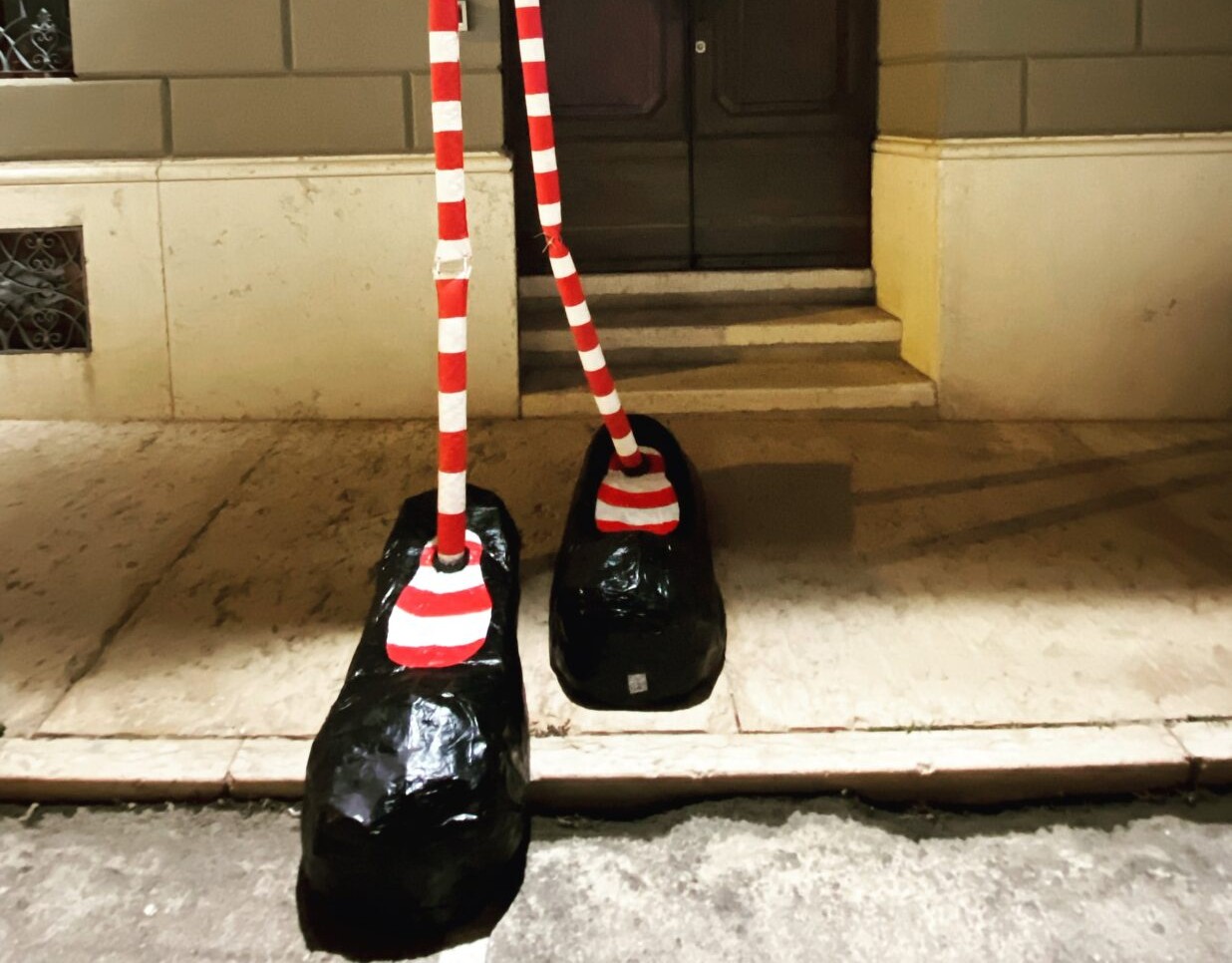 Il percorso visivo parte dalle vetrine urbane del MIMUMMO – Micro Museo di Monza, che diventano quinte sceniche per queste presenze sfrontate. Spuntano dietro i vetri come marionette ingovernabili, ora vestite di righe verticali rosso fuoco, ora immerse in paesaggi marini con coralli e anemoni, ora adagiate in un prato verde. L’effetto è straniante lo spettatore si ritrova a fare i conti con gambe più grandi di lui, che sembrano muoversi davvero, con un passo che è ora danzante, ora goffo, ora teneramente buffo.