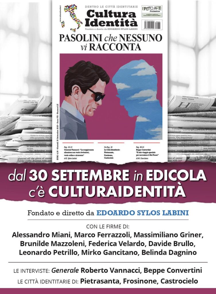 Ci sono pochi personaggi che a cinquant’anni dalla loro morte sono assolutamente attuali. Pier Paolo Pasolini è uno di questi, come cronaca e storia dei nostri giorni presenti ci racconta, quotidianamente. E come racconta il sessantesimo numero di CulturaIdentità, in edicola da martedì 30 settembre, con una bellissima copertina dell’artista Giuseppe Veneziano – intervistato da Emanuele Beluffi – e dedicata al grande poeta, regista e scrittore ucciso nella notte fra 1° e 2 novembre 1975.