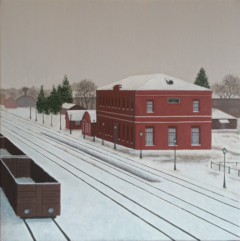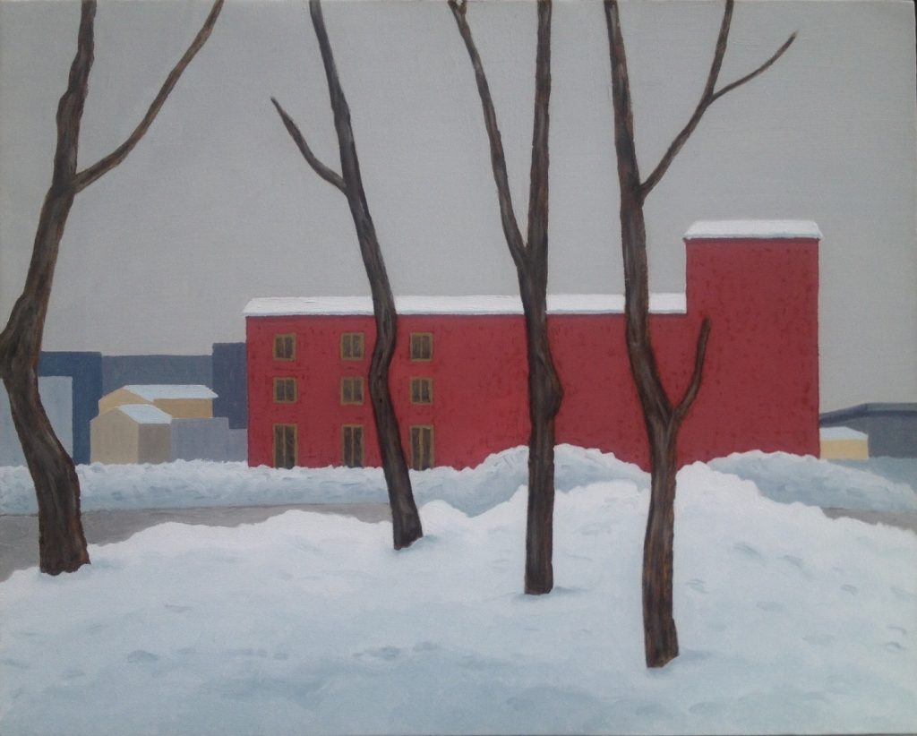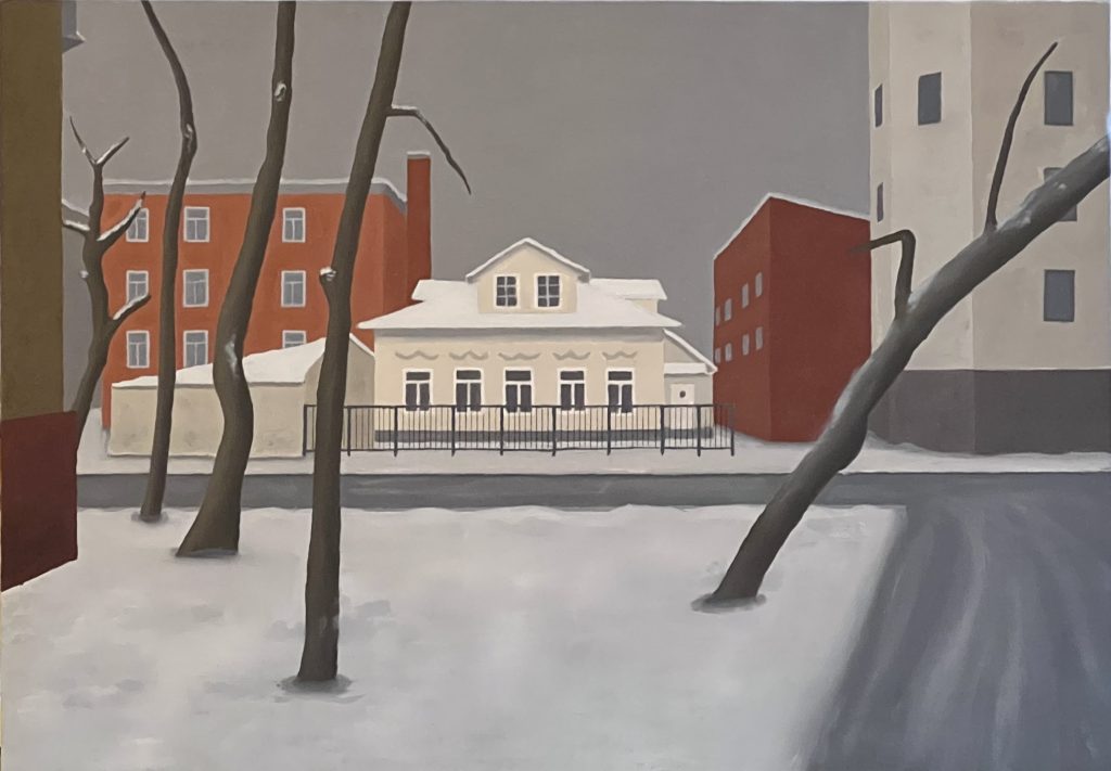 Le opere esposte – La scuola rossa, Prima neve, La traversata, Verso il Pireo, Milano Bicocca – sono frammenti di un racconto in cui il reale si trasfigura in metafisica quotidiana. Nei suoi paesaggi non compaiono figure umane, ma tutto parla di presenza: i camion fermi, le navi immobili, le piazze deserte diventano protagonisti di una narrazione silenziosa, quasi un diario di viaggio scritto a matita.