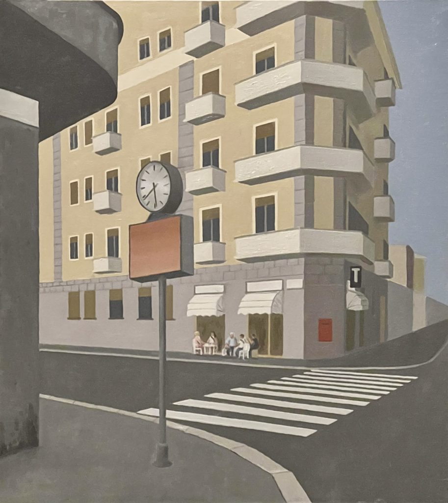 C’è una nitidezza che inganna, nei suoi quadri. Tutto sembra chiaro, semplice, quasi infantile nella sua compostezza formale. Eppure, dietro quella chiarezza, si muove una tensione segreta: la solitudine delle periferie, la nostalgia dei viaggi, il ricordo di una stagione passata. La chiarezza come valore primo”, dice Aldo Damioli, maestro e amico dell’artista. Ma è una chiarezza che non rassicura: è quella che si prova all’alba, quando la luce è troppo pura e ogni cosa rivela la sua esattezza — e anche la sua assenza.
